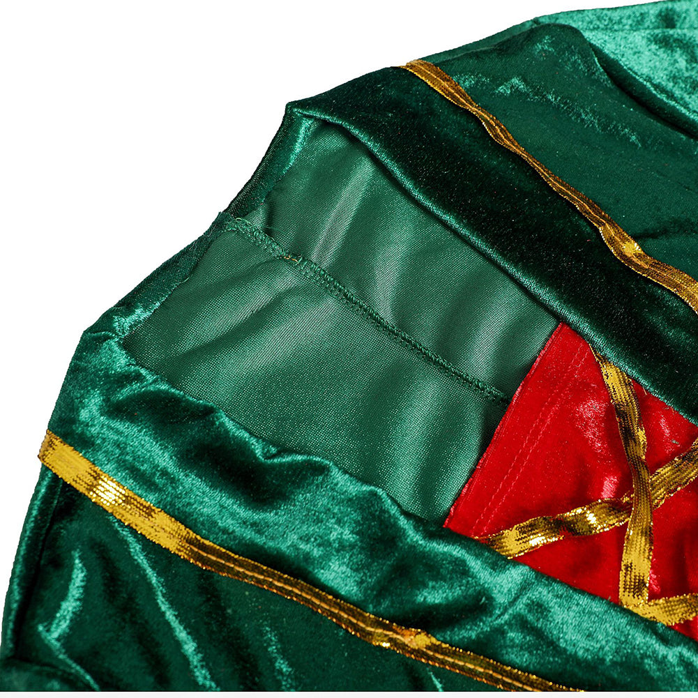 - Fabric: The green sections have a soft, shiny velvety finish, while the red sections are a solid, slightly matte texture. The gold trim is a decorative, shiny accent.