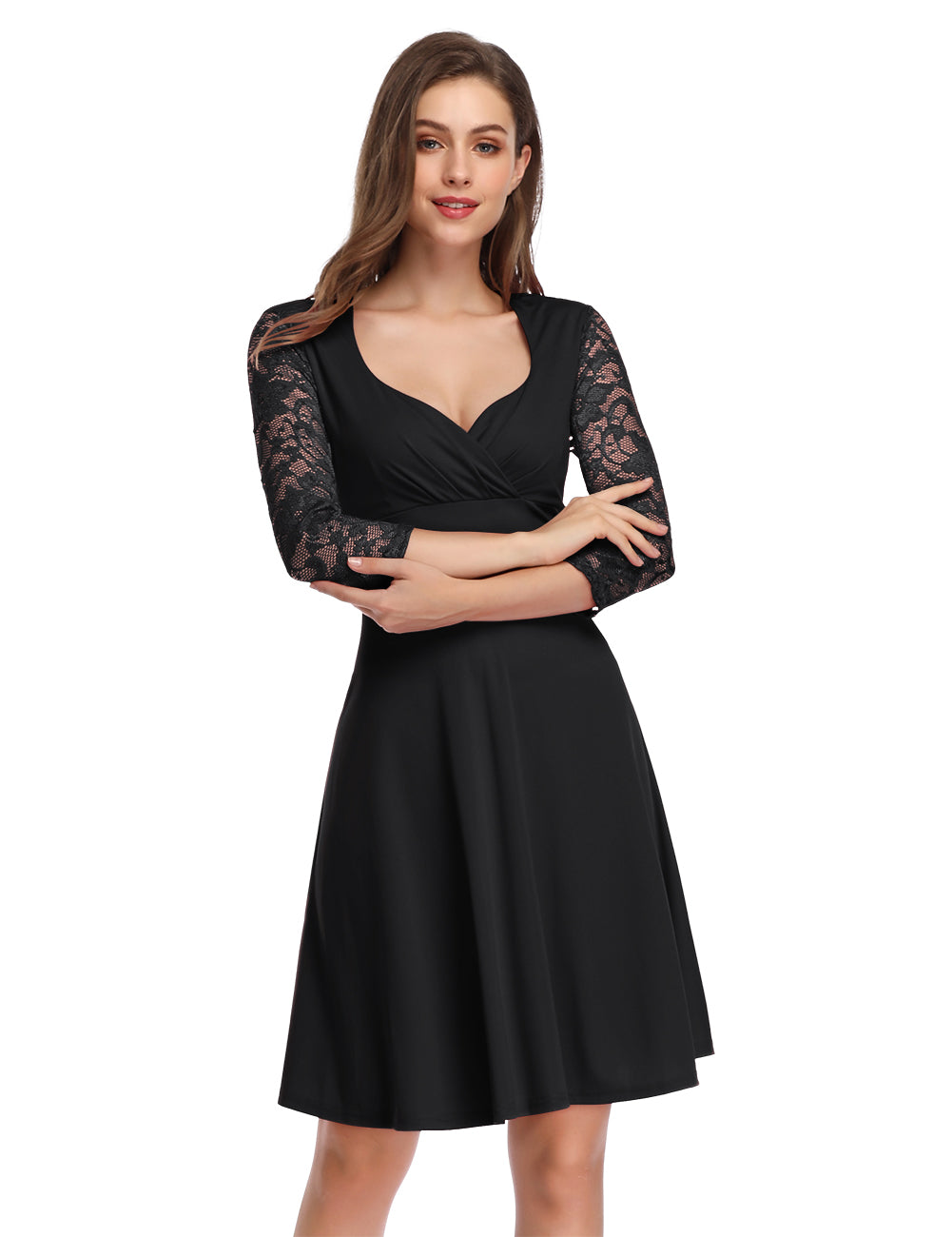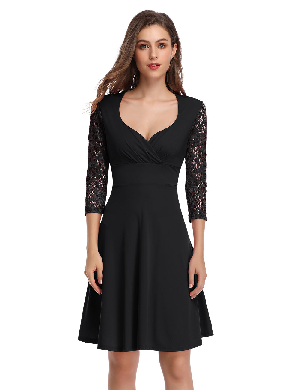 - Design: Deep V-neck with wrap-style bust, ruched/wrapped bust detail, fitted waist, flared A-line skirt, and three – quarter length lace sleeves with floral/openwork pattern.