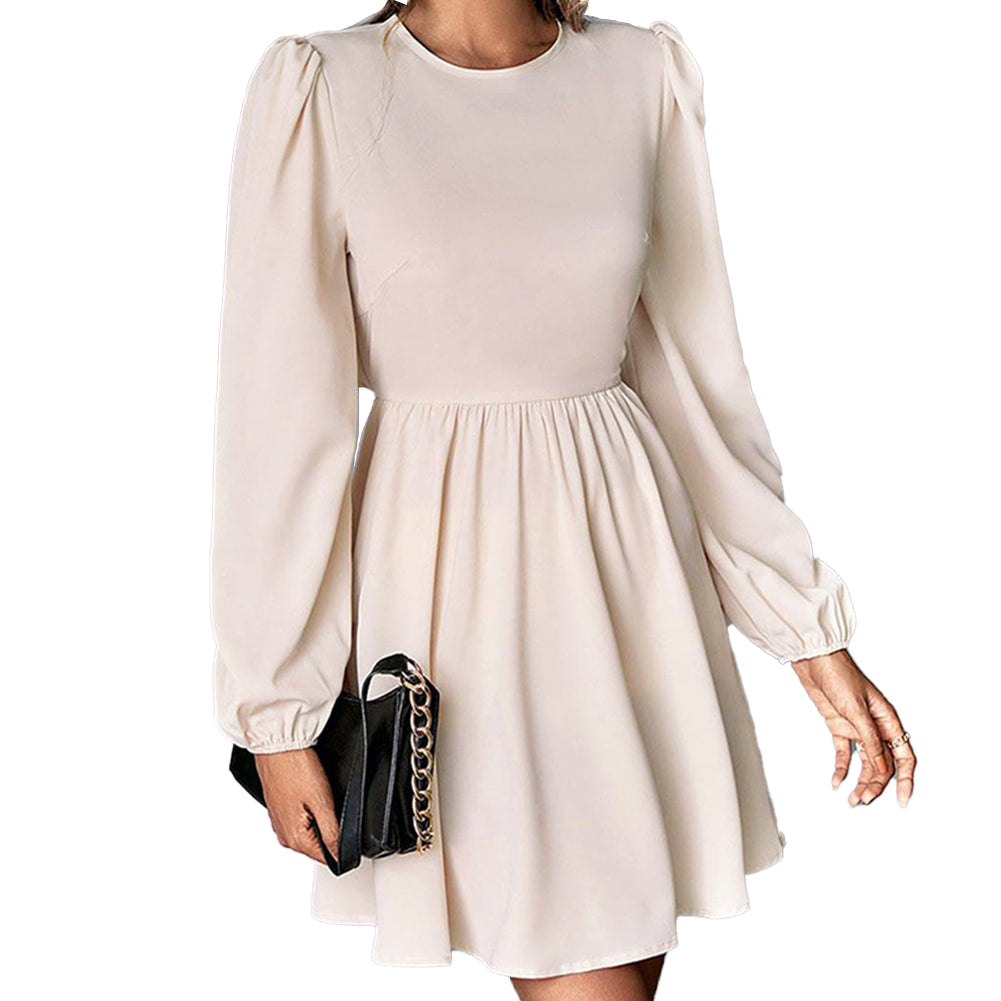 - Design: This dress features a tied neckline with a small cutout at the back, long puffed sleeves with elasticized cuffs, and a back cutout at the waist with a tie for fit adjustment. There are also additional ties at the neck and waist area for styling.