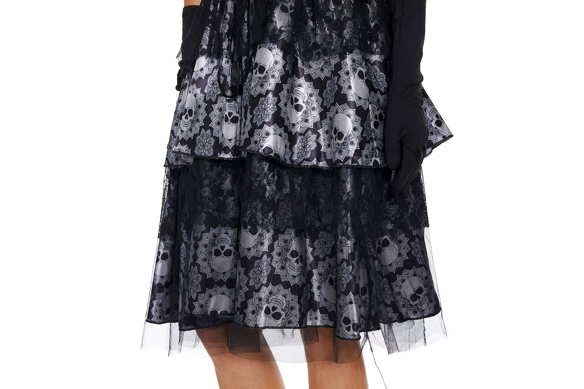 - Fabric: The main fabric is a printed cotton/polyester blend for the skull pattern and corset panel. The skirt layers are made of tulle, and there’s delicate lace on the neckline, smooth satin – like fabric on the corset panel, and stretchy nylon/spandex in the gloves (part of the costume).