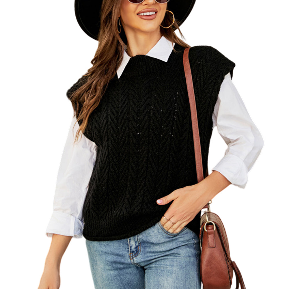 Elevate your fall wardrobe with this stylish sleeveless knit sweater vest. Its black cable – knit design paired with a white collared shirt creates a layered, polished look. The thick and textured fabric offers both warmth and a trendy aesthetic.
