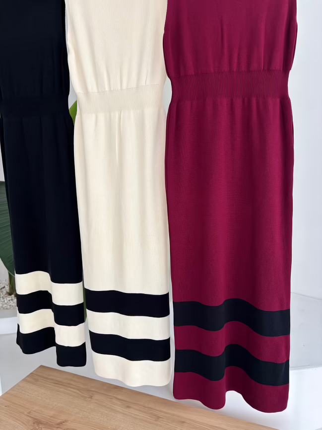 This dress is a refined staple with a modern twist. Crafted from soft, body-skimming knit, this dress features a sleek silhouette that flows into a subtly flared skirt with contrast stripe detailing for added dimension and movement. The minimal top is balanced by the bold stripe accents below, making it an effortless choice for both daywear and more styled-up occasions. Whether paired with boots or refined flats, this piece brings quiet confidence to any outfit. Details: Soft, medium-weight knit for structure and comfort Contrast stripe detail at the skirt Fitted bodice with a fluid hemline A high neckline Midi length for versatile styling A wardrobe essential for transitional dressing, with a sporty-chic edge.