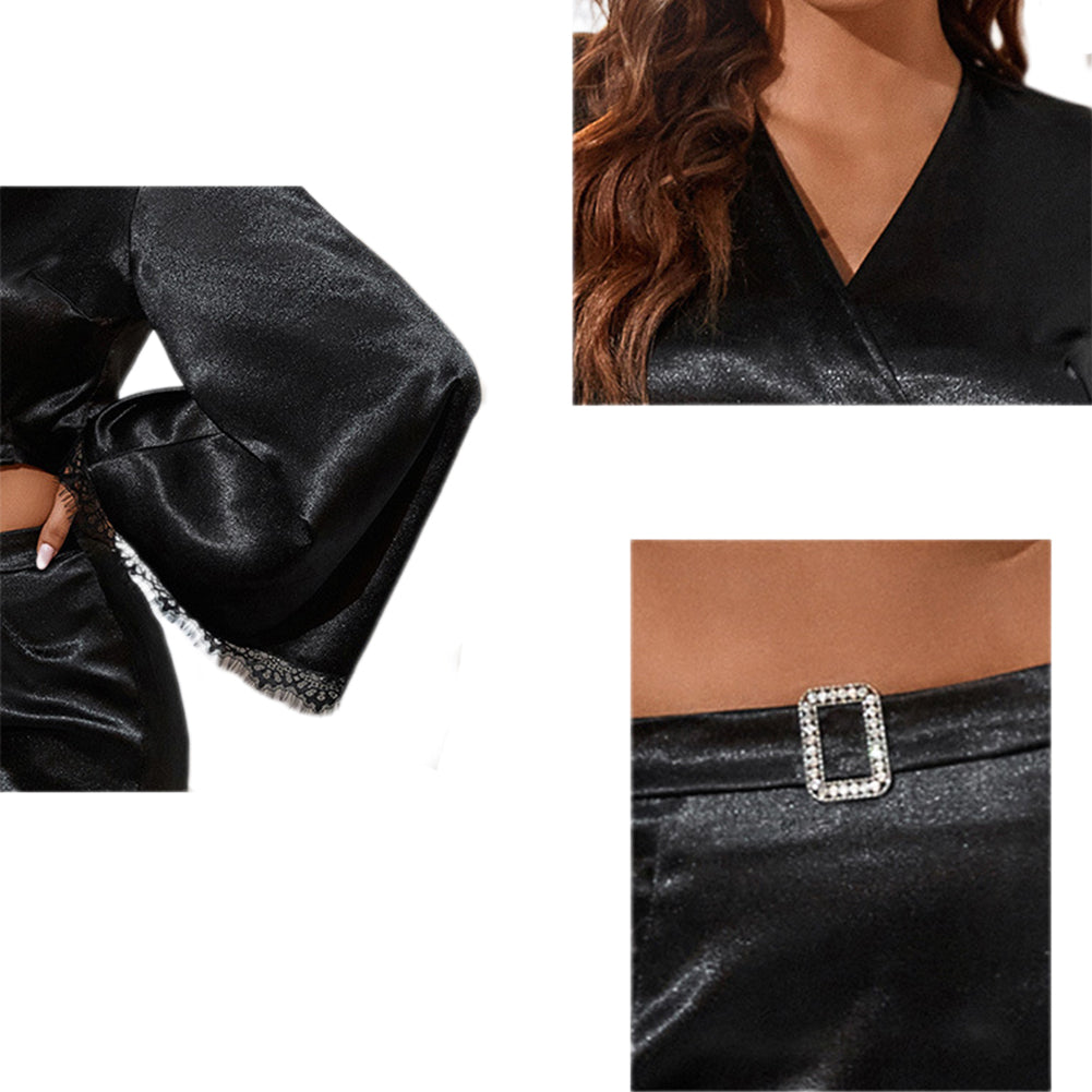 - Design: Deep V – neckline with a wrap silhouette, long sleeves with fitted cuffs, self – tie belt at the waist tied in a bow, wrap – front construction, and vertical ribbed texture.