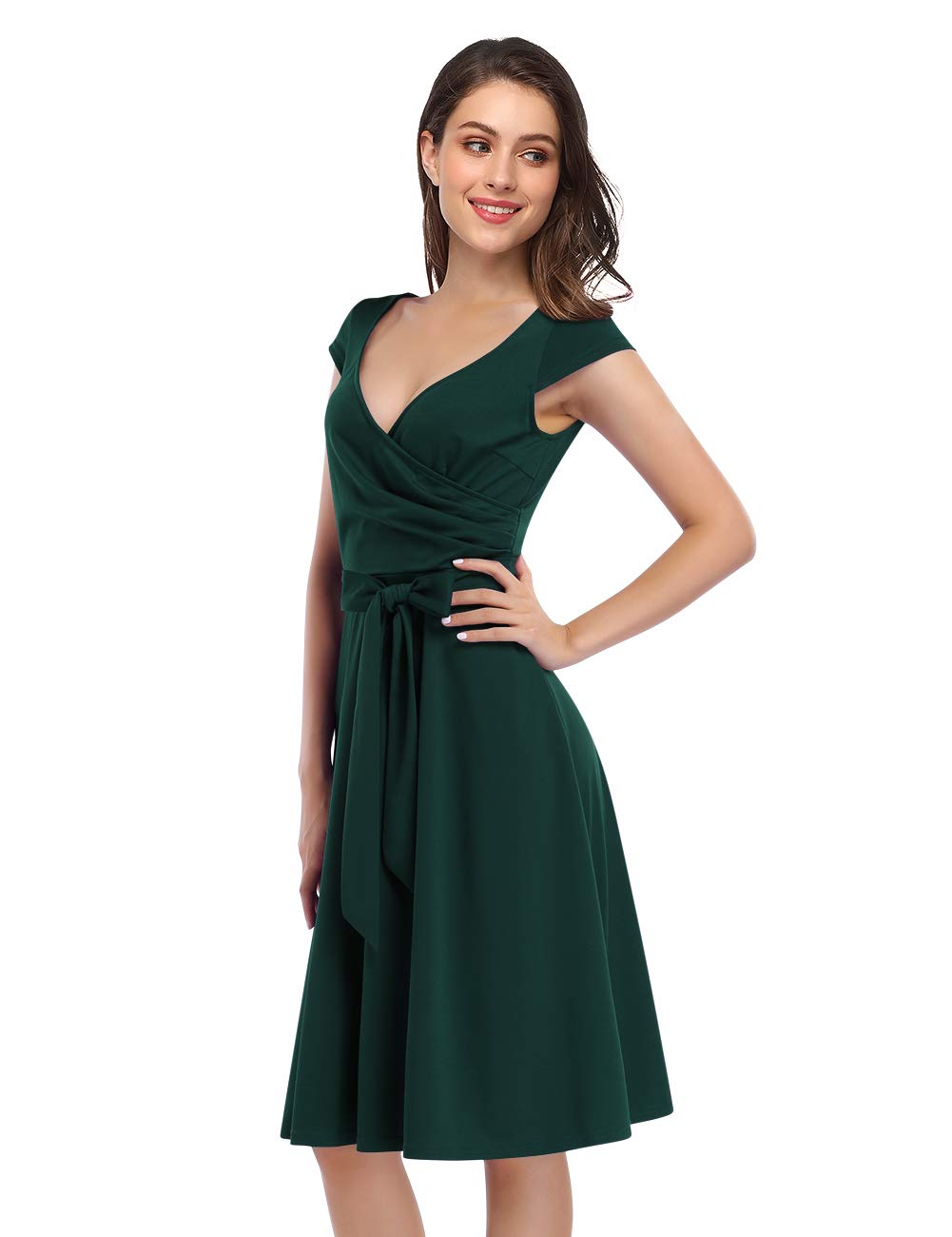 - Design: The dress features a deep V – neckline, short cap sleeves, and a defined waist. One style has a wrap – style front with ruching at the bust and a self – tie belt with a bow, while the other has a simple V – neck, a straight belted band, and vertical seams in the skirt. The second style also has a scalloped hemline.