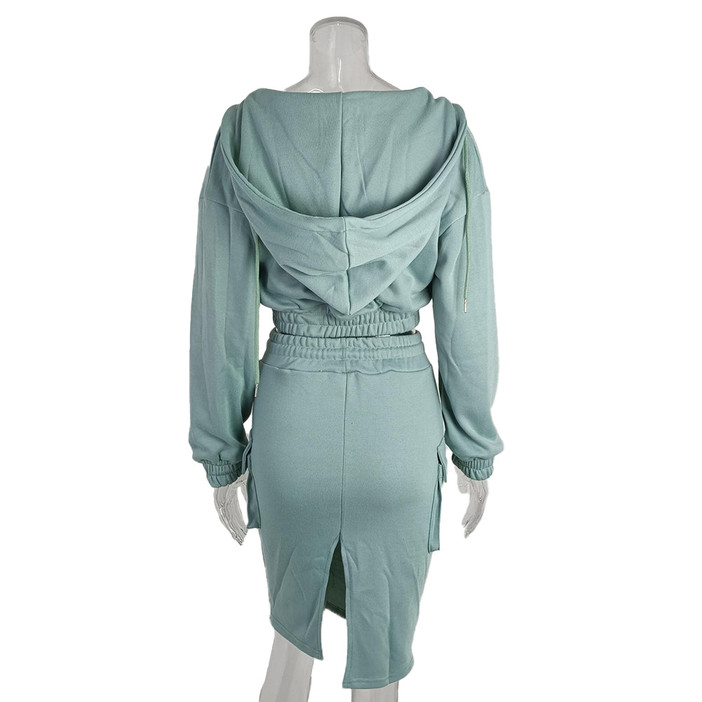 - Design: Features a hood with drawstrings, long sleeves with ribbed cuffs, front cargo – style pockets, a high – waisted elastic waistband with a drawstring, and a structured form – fitting skirt.