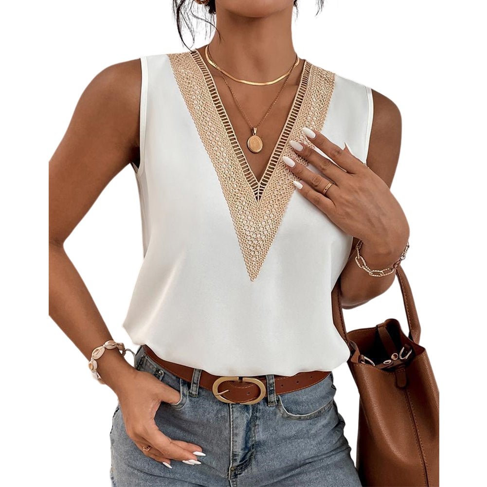 - Design: Sleeveless top with a V – neck featuring a decorative, textured lace trim in a triangular V – shape at the front. It has a straight or slightly A – line silhouette.