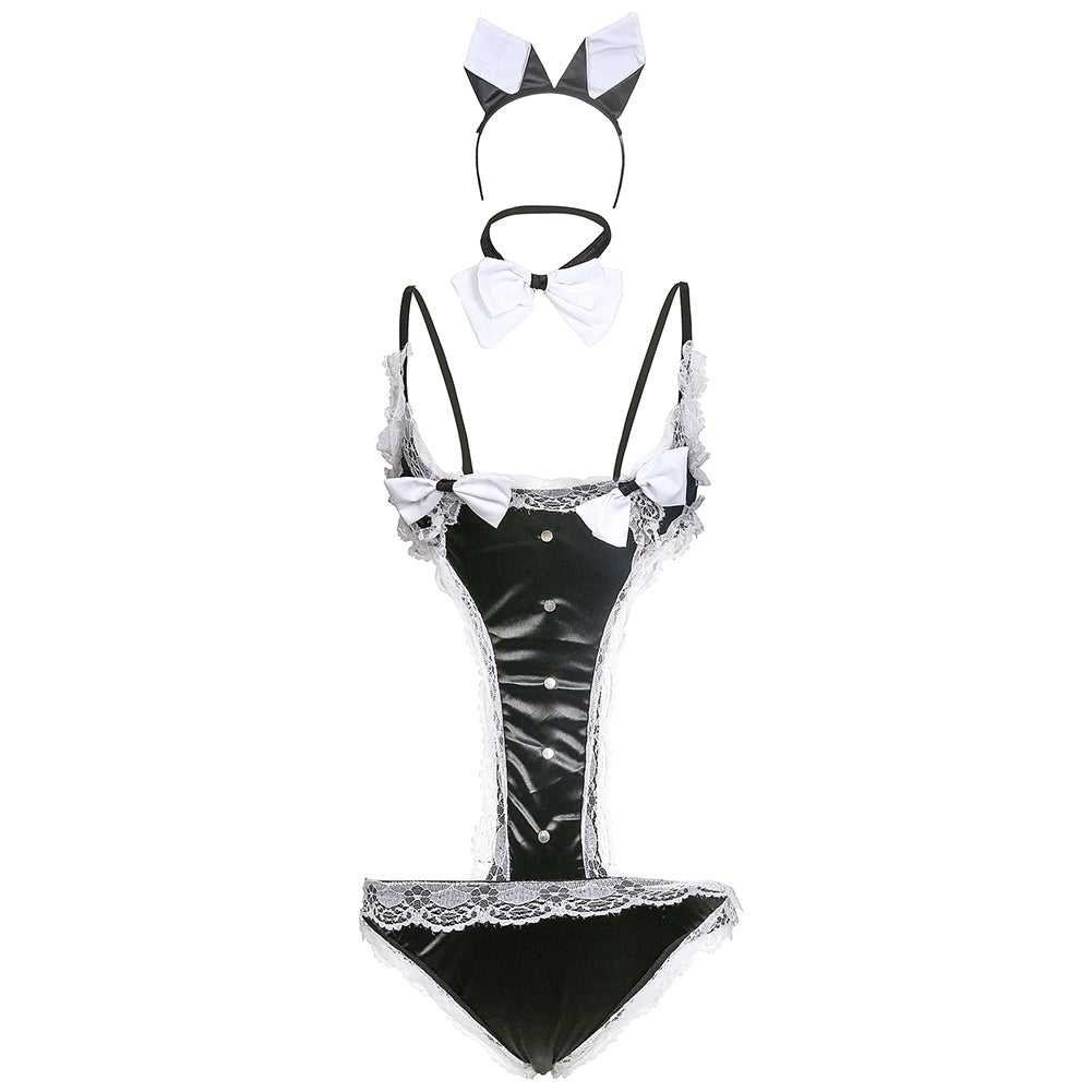 Indulge in a world of fantasy and fun with this captivating bunny costume. This two – piece set combines the charm of a bunny girl with the allure of a French maid, featuring a bustier top and a brief bottom. The set also includes stylish wrist cuffs, a headband with bunny ears, a neck bow, and a feather tail, making it perfect for adding a touch of playfulness to special occasions.