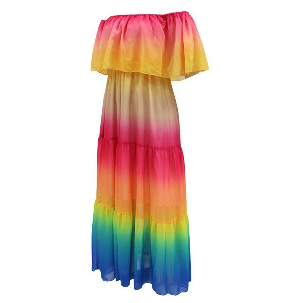 Step into a world of bohemian charm with this stunning maxi dress. Its off – the – shoulder design is both alluring and stylish, while the gradient color scheme from pink to blue creates a visually captivating look. The tiered skirt adds a playful and romantic touch.