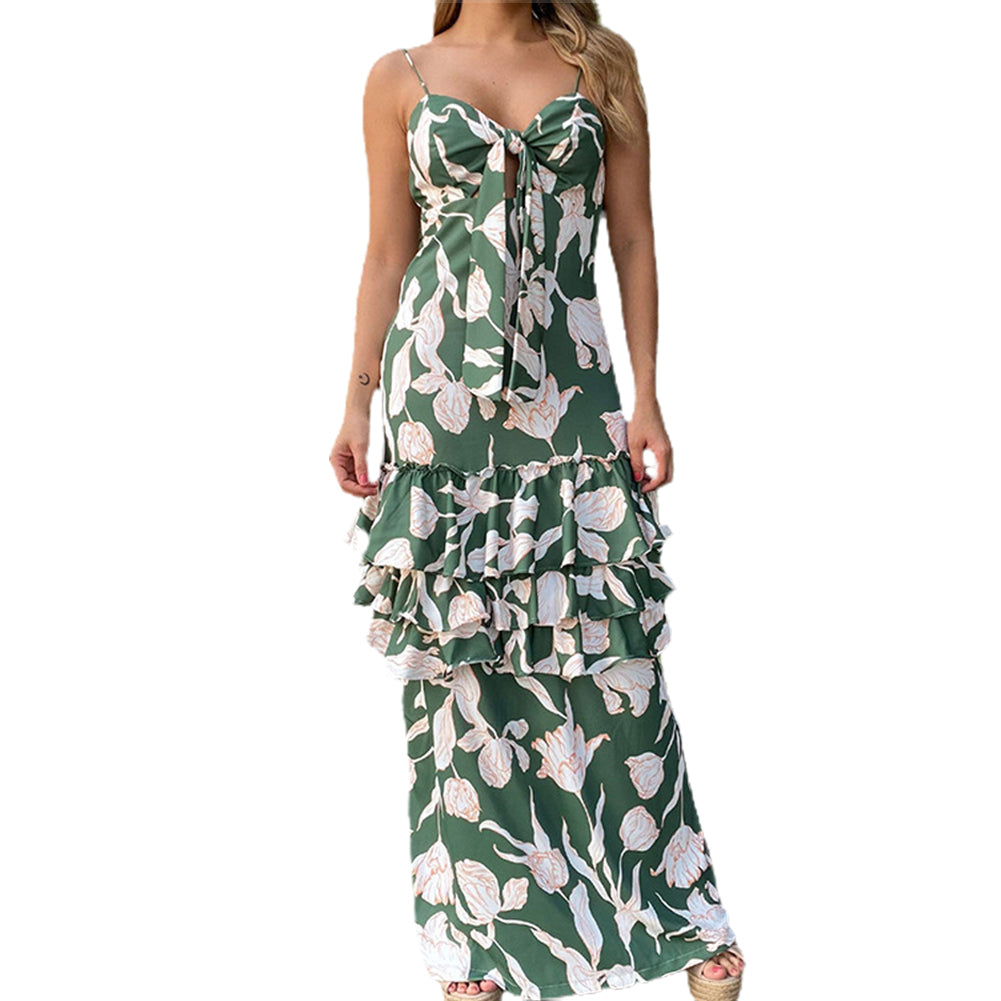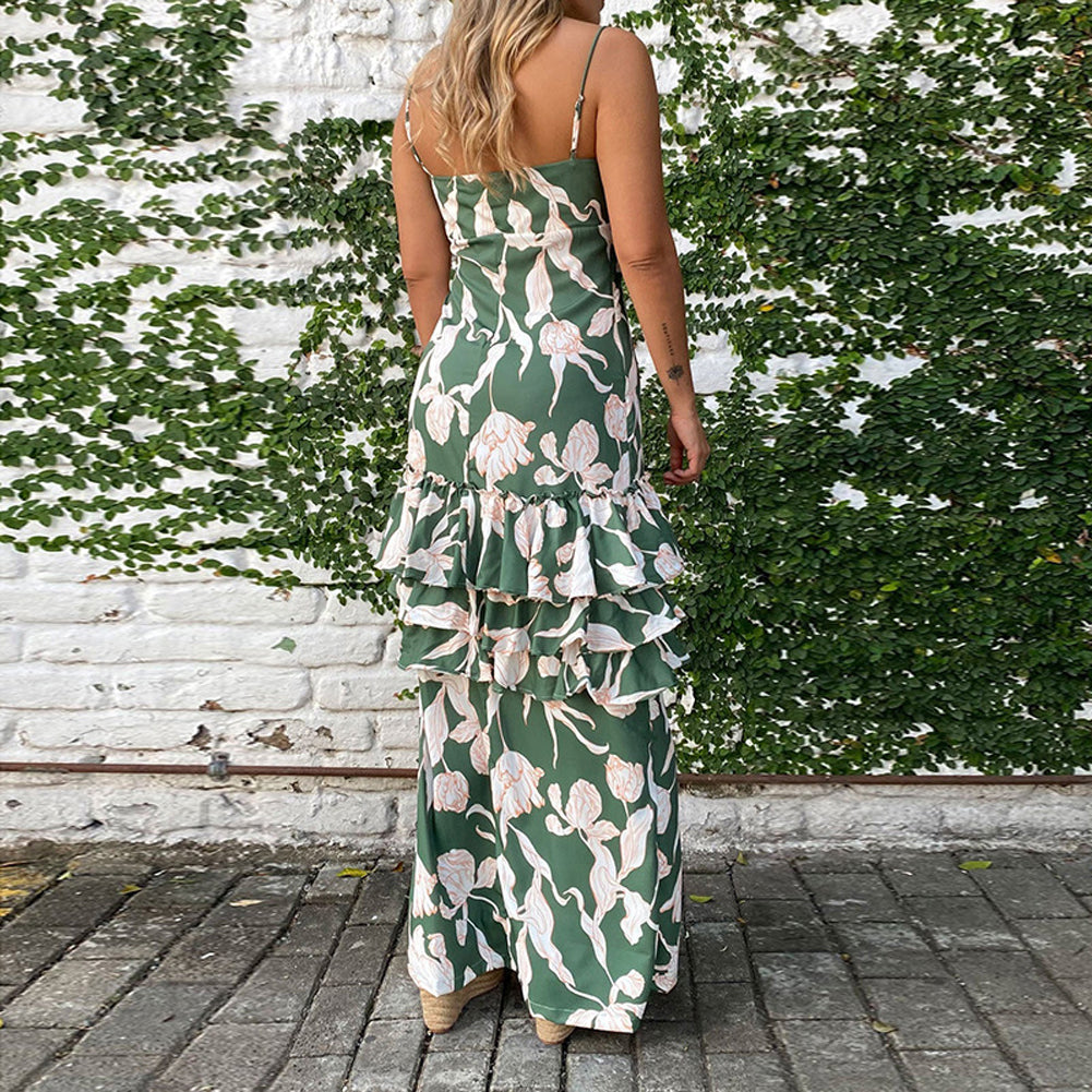 Step into a world of romance and femininity with this stunning maxi dress. The dark green base adorned with a beautiful floral print of white and light peach accents is a sight to behold. The tiered ruffled skirt adds a touch of playfulness and movement, making it perfect for any summer occasion.
