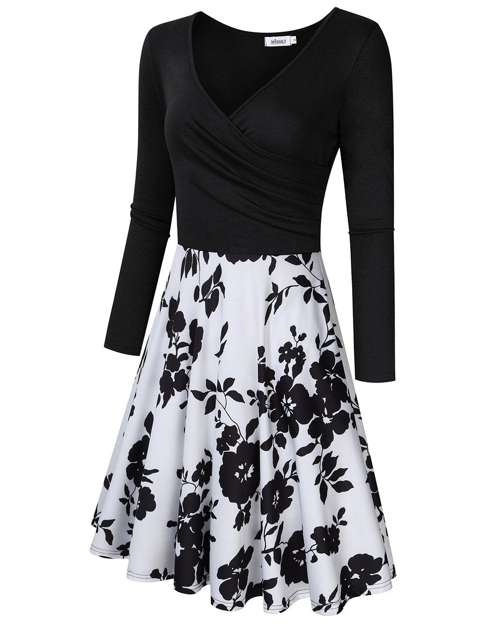 - Design: Features a V – neck at the front and a round/crew neck at the back. It has long sleeves and a flared A – line skirt. There is color – blocking with a solid black bodice and a white skirt with black floral print.